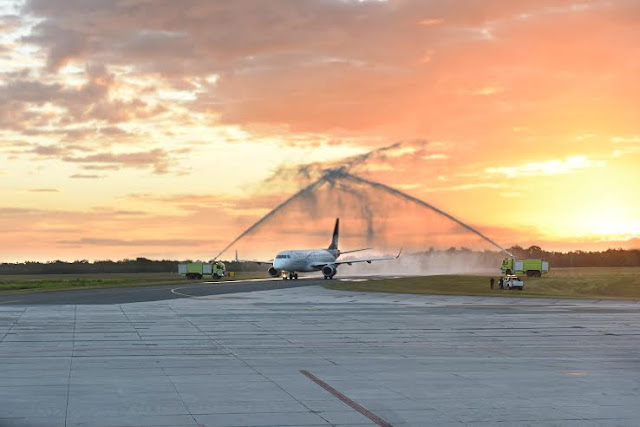Previo a la conferencia de prensa con los directivos de Aeroméxico en el hotel Sheraton Santo Domingo, fue recibido el vuelo inaugural de la nueva ruta con el simbólico arco de agua entre dos camiones de bomberos a su llegada al Aeropuerto Internacional de Las Américas a las 6:50 de la mañana.
